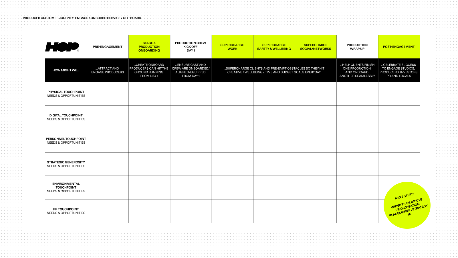 To help her synthesise and sell her vision, I worked with Katya closely, interviewing and journey mapping an engagement, onboarding, servicing and offboarding experience for the likes of Amazon and Netflix production teams. Having formalised her vision and the stages of a production, we mapped physical, digital, personal and PR touchpoints on which to design our website, communications and digital experiences against.