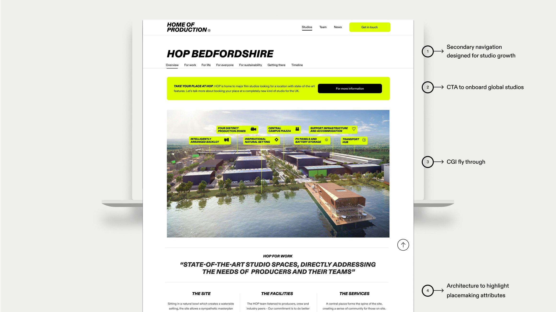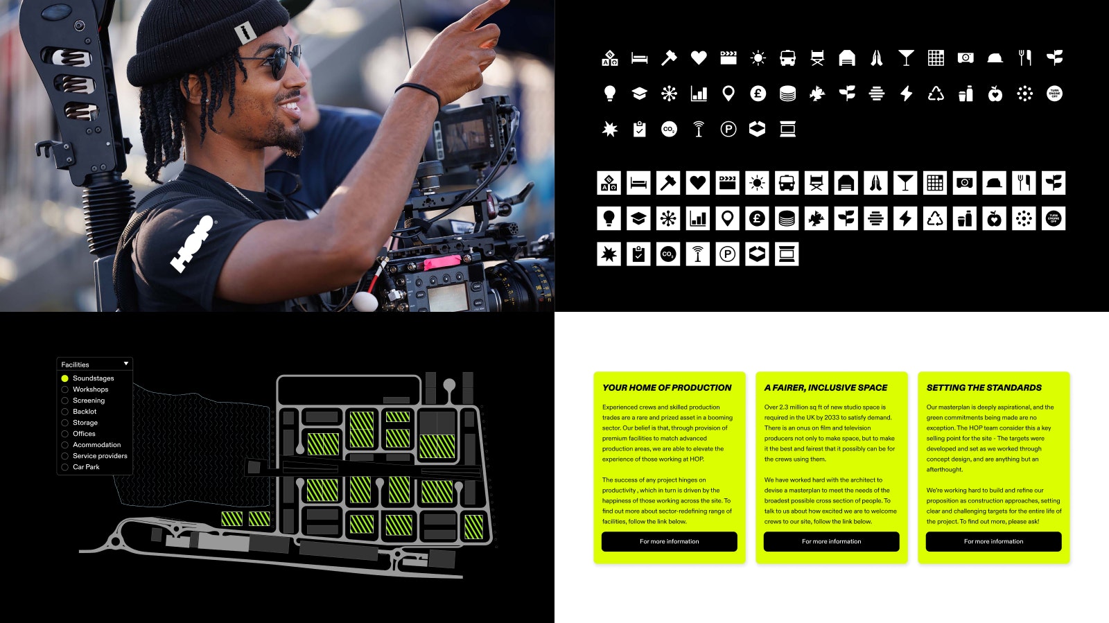 Katya Baker, an experienced producer and placemaker, had a burning ambition to re-invent global film studios; designing them around the human needs of a production. Alongside real estate developer VERB, they set about creating a masterplan for the ‘Next generation of film studios'. To push the consultation process forward as well as attract potential productions to the site they needed a brand, placemaking strategy and business blueprint to show their disruptive thinking.